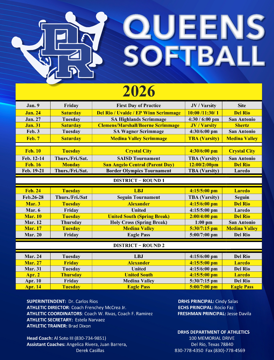 Del Rio Athletics will always strive to achieve the highest level of excellence in our student athletes on and off the playing field, court, track, and course. Our student athletes will be held to the highest academic standards and strictest code of conduct on and off the field(s) of play.